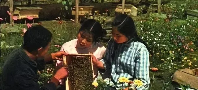 往后几张,画面一下子就密实起来了。有人给植物授粉,有人蹲在花丛边跟养蜂老人学看蜂框,有人弯着腰在地里除草,还有人抱着沉甸甸的谷穗,抬头看天,脸上全是收成带来的喜气。这里面最打动人的,不是“劳动”这个大词,而是那些小动作:袖口挽起来,草帽背在身后,手伸进作物间,额前头发被汗打湿了也顾不上。别看只是一个小细节,那个年代过日子的实感一下就出来了。