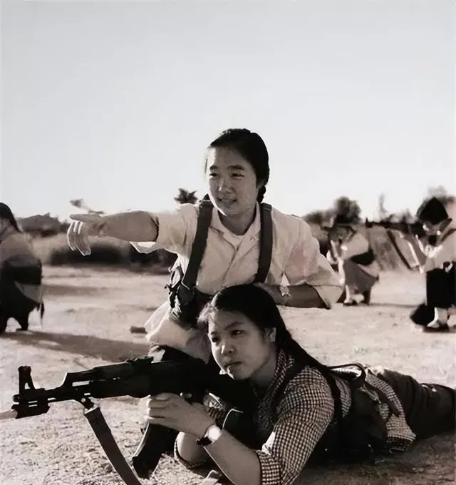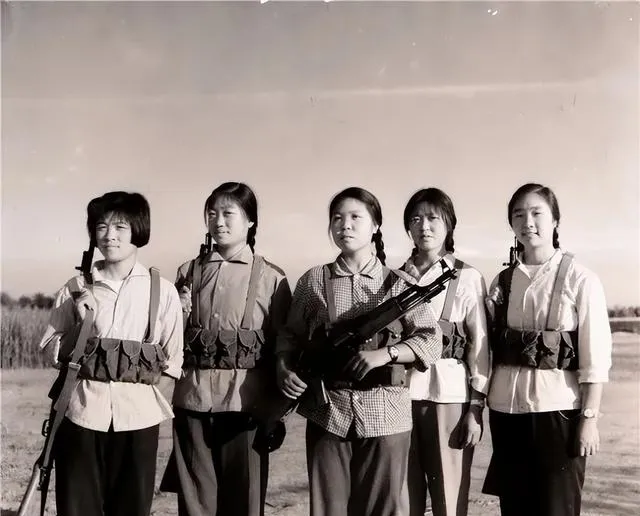 几张民兵训练的照片也挺有冲击力。姑娘们背着枪,站成一排,表情很严肃;还有一张卧姿射击,旁边的人伸手指方向,动作有板有眼。可你仔细看她们的脸,又还是年轻姑娘的样子,辫子、圆脸、手表、格子衣,全都很生活化。这种反差很有意思:一边是训练场上的利索,一边是青春里没褪掉的稚气。