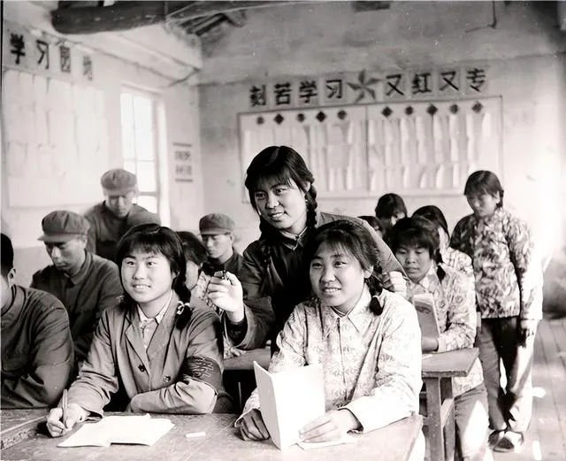我挺喜欢几张“学习”的照片。女知青围着老人,低头认真听;教室里木桌板凳挤得满满当当,窗户透进来的光有点白,墙上还写着标语;还有几个姑娘围在一起看报、看材料,脑袋都凑得很近。你会发现,她们下乡不只是干活,也是在学怎么跟土地、跟农村生活打交道。那种认真,不是假装出来的。因为不会,就得问;因为不懂,就得学。