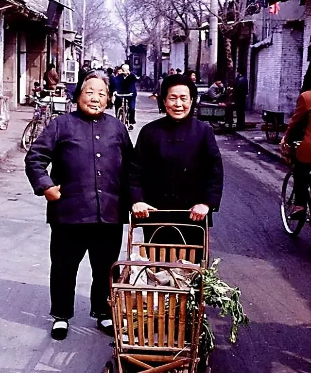 第一张最抓人的,其实不是两位老人,而是前面那辆小竹车。竹条编的靠背,木质扶手,车身不大,推起来却很稳。很多那个年代长大的孩子,真是坐着这种车出门的。中间要是有隔板,往高处一放,还能临时当“小桌子”,一边坐一个孩子,手里分点零嘴,已经觉得特别满足了。
