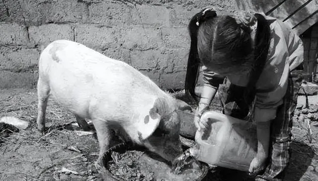 这张黑白照片,一下把农村日常拉到了眼前。小姑娘扎着辫子,弯着腰,把盆里的东西往食槽里倒,猪已经低头拱过去了。动作一点都不“摆拍”,就是家里再普通不过的一项活。