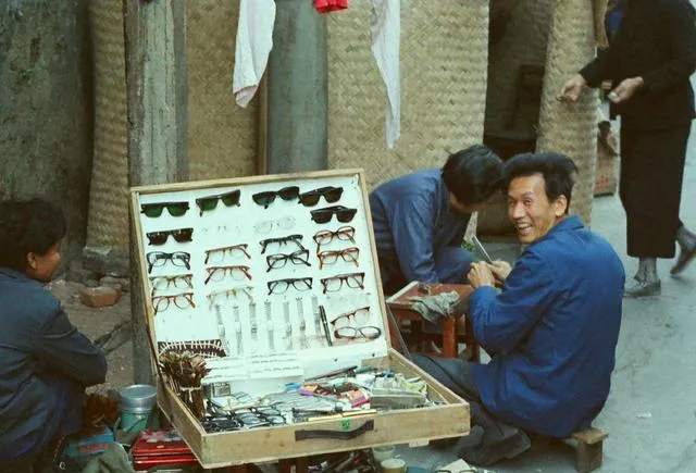 这张我看了好一会儿。一个木箱摊开,里面整整齐齐摆着眼镜框、镜片、工具,师傅坐在小板凳上,回头一笑,特别生动。别看只是个街头摊子,那个年代不少手艺活,就是这样做起来的。