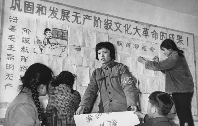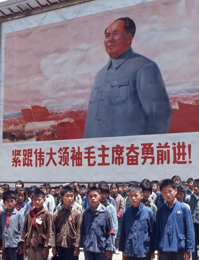 这一张信息量很大。大幅宣传画、鲜红的标语、下面站得整整齐齐的学生,构成了很典型的时代画面。可我第一眼注意到的,反而是孩子们身上的衣服。蓝的、灰的、旧旧的,袖口还有磨损,红领巾系得也不完全一样。