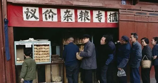 “议价杂粮专柜”几个字一出来,年代感立刻就有了。小小一个窗口,外面排着队,手里拎着篮子、布袋,神情都盯着柜台。买东西不是进门随便挑,而是排、等、算着来。