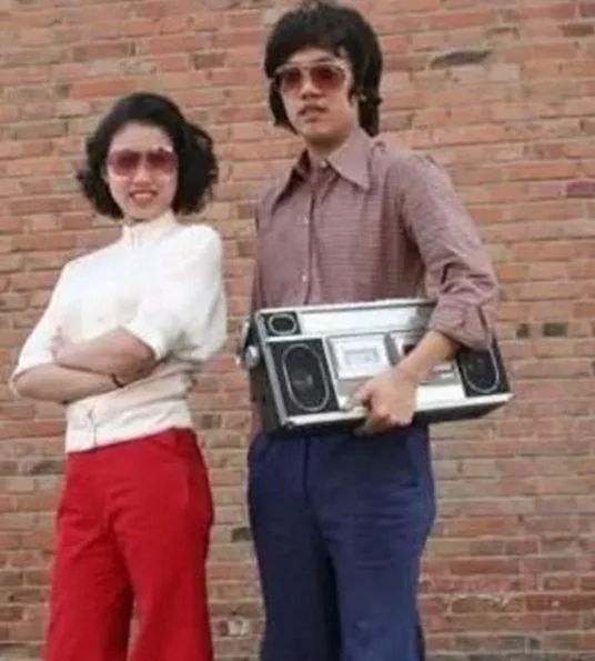 看到这张合影,气氛一下就不一样了。发型、妆容、西装、礼服,全都变得洋气起来。再往后看那张砖墙前的男女,太阳镜一戴,喇叭裤一穿,男人手里还拎着大收录机,那个劲头,真是一秒进入八十年代。