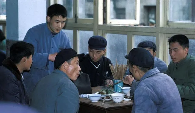饭馆那张更妙。几个人围着桌子吃饭,桌上就那么几碗几盘,窗户大,光线冷,帽子和蓝上衣凑在一起,就是国营饭店最常见的样子。那时一顿饺子、一份素炒菜,已经是很像样的吃食了。