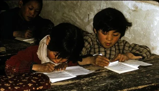 学校里的场景也很真。有人贴墙报,有人写字,有人站在中间安排事情。再看煤油灯下读书的孩子,桌子旧,墙面粗,光线暗,可两个人凑得很近,读得特别认真。书本学杂费不多,文具也简单,可很多人的求学路,就是这么一点点走出来的。