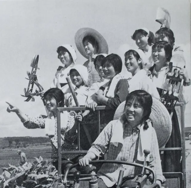 另一张里,年轻姑娘站在农具车上,戴草帽、拿工具,笑得很亮。你会发现,那个年代留下来的青春照,并不精致,但特别有劲。