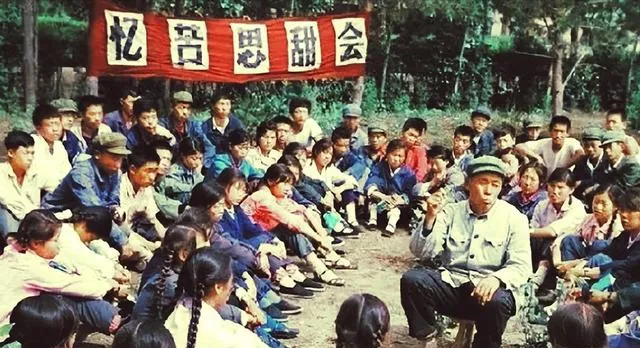 “忆苦思甜会”这张,看着特别有现场感。一圈人围着坐,年轻人、孩子、老人都在,前面讲话的人手势很足,后面的人听得认真。地是土的,椅子都省了,大家就这么席地而坐。现在再看,最有意思的不是标语,而是那种集体生活的密度。很多事,不靠手机通知,一喊就能凑起一大圈人。