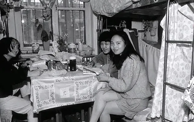 这张黑白宿舍照很耐看。小桌子上铺着花布,书本、水杯、瓶瓶罐罐都挤在一起,上铺垂着床单,窗户也不大。条件肯定谈不上好,但几个年轻姑娘坐在那里,表情却很轻松。以前总觉得那个年代苦,可你真看进这些细节,会发现大家也在很认真地过自己的小日子。