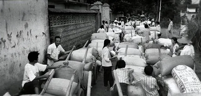 满街都是装得鼓鼓的麻袋,独轮车、板车挤在一起,路窄,人却很多。这样的画面,现在年轻人可能不太熟。那时候运粮、交粮,真是靠人力一点点推出来的。你看那些人的姿势,肩膀前倾,手臂发力,没有谁是轻轻松松的。那个年代的“生活”,很多时候就是体力活。
