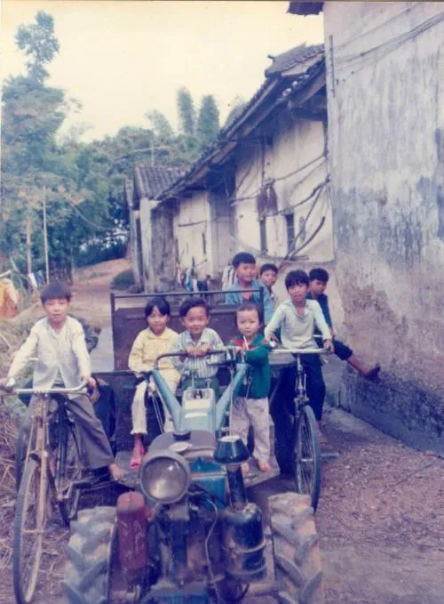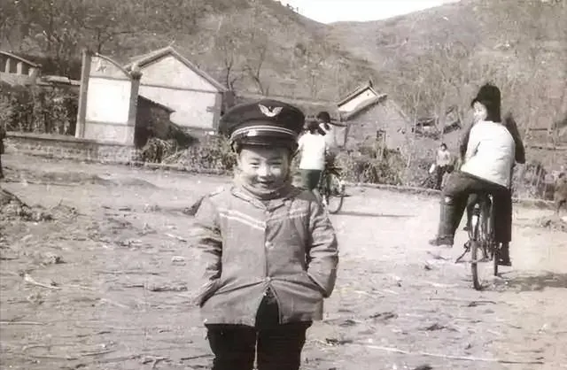 这个小男孩站在前面,戴着大檐帽,手插在口袋里,表情还有点小得意。背景里有人骑车,有土路,有村舍。照片很普通,可就是这种普通最难得。小时候谁没穿过几件不太合身的衣服,谁没在镜头前故作镇定过?一张照片,能把童年的小神气都留下来。