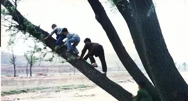 孩子爬树这张,看着都替他们捏把汗。可这就是很多人的童年:上树、下河、摸知了、打弹珠、滚铁环,玩具很多都是自己找、自己做。现在孩子的玩具比那时多太多了,可像这种满地跑、满村钻的野劲儿,倒是越来越少了。