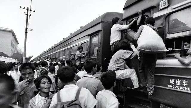 后面几张照片,像是把80年代的日常又补全了:牛车上坐满年轻人,笑声都快从画里溢出来;夏天河里一群孩子泡水,天再热也舍不得上岸;教室里桌椅旧、书本厚,孩子们埋头写字;火车站台上,有人买吃的,有人挤硬座车门,行李是蛇皮袋、布包、搪瓷缸,一看就知道是远行。那时出门不轻松,可大家也真敢闯。