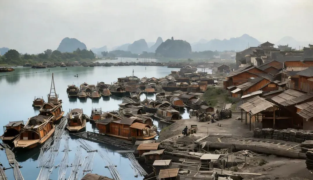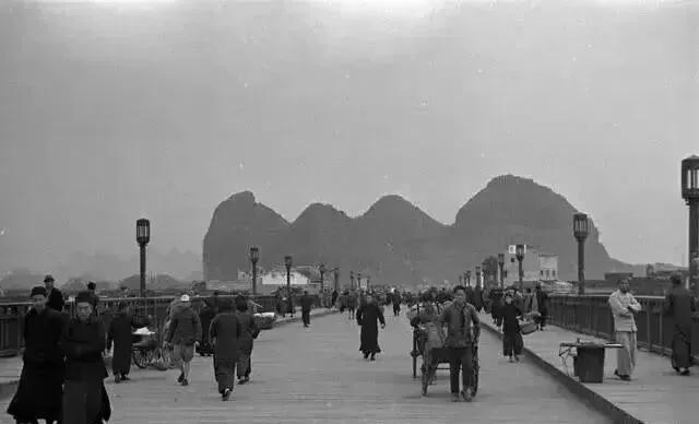 1942年时的漓江码头(盐街/定桂门码头)照片展现了1942年左右漓江航运的繁忙景象,密密麻麻的木船、吊脚楼式的码头建筑与远处的喀斯特峰林共同构成了“桂林山水甲天下”的经典画面。↓