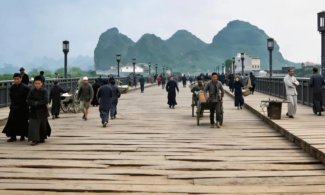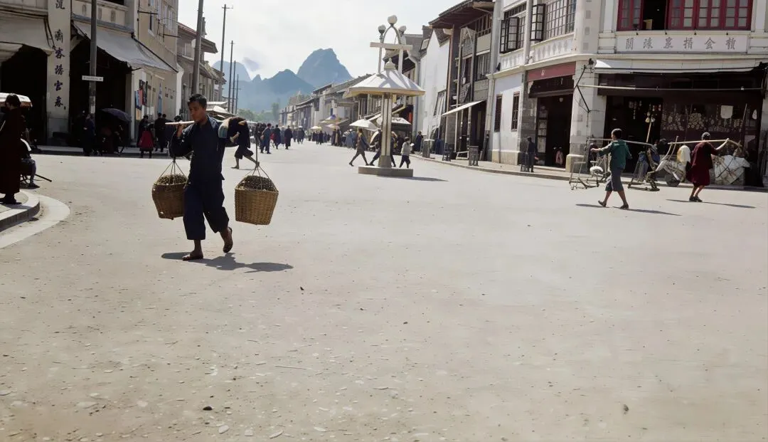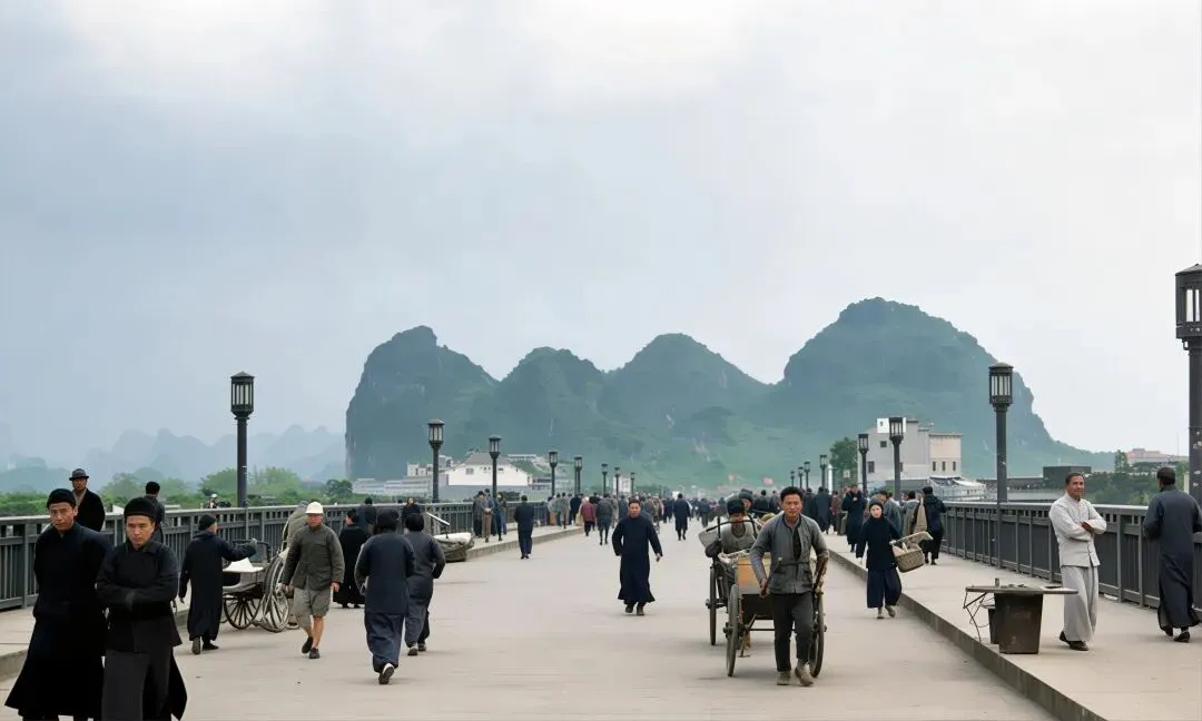 在民国时期的桂林城,市集是这座山水名城最鲜活的脉搏。青石板路被岁月磨得发亮,骑楼的廊檐下挂着褪色的布幌,挑夫的扁担吱呀作响,商贩的吆喝与孩童的嬉闹交织成一曲市井歌谣,将西南重镇的烟火气揉进每一个日常。桂林的市集依城而建,以正阳路、中山路等主干道为骨架,向四周街巷蔓延。从清晨到日暮,不同时段的市集有着截然不同的模样:黎明时分,挑着蔬菜、柴薪的农民从城郊赶来,在城门洞下的空地上卸下担子,青竹篮里的青菜还沾着露水,竹筐里的土鸡扑腾着翅膀,最早的交易便在熹微的晨光中开始。
