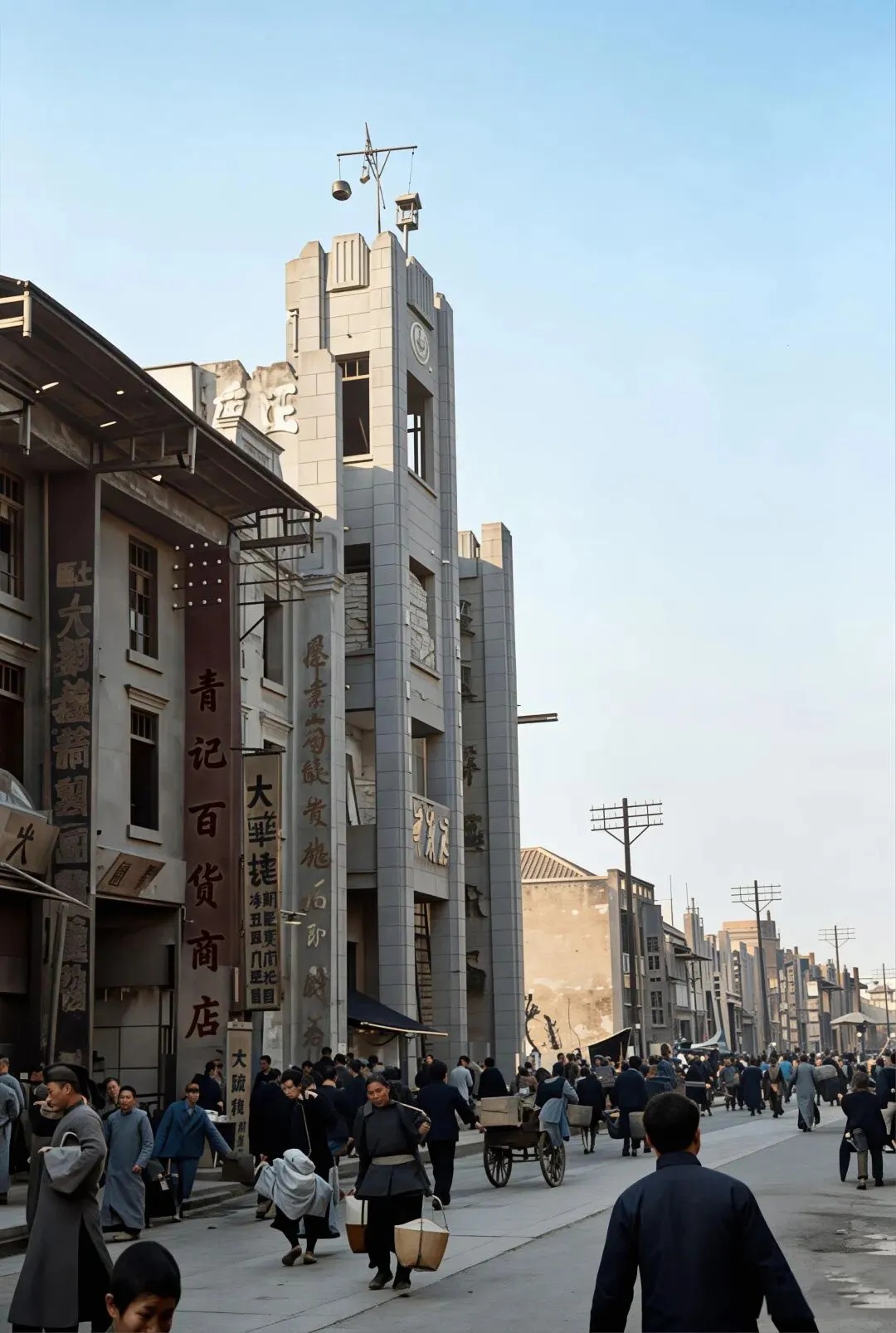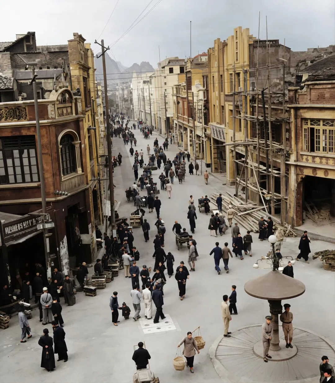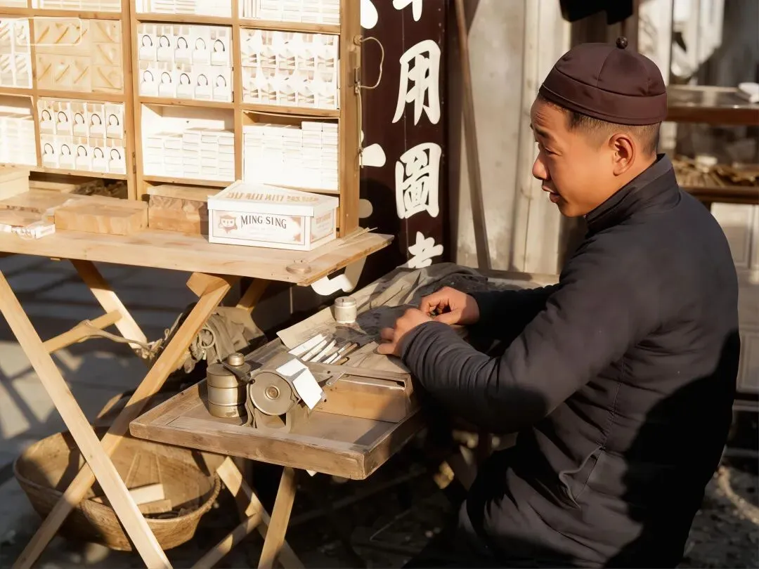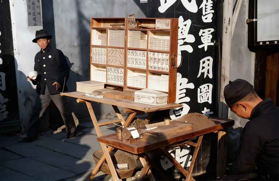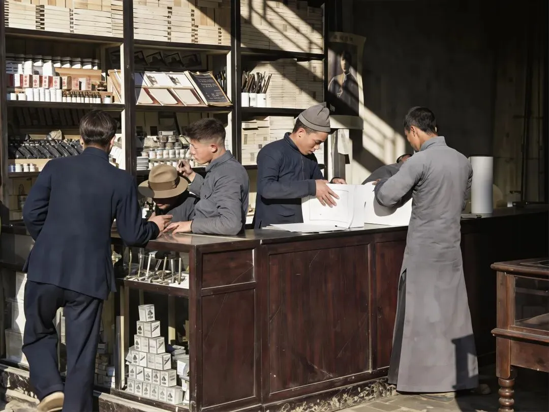 这是原图,但根据现有资料记载,桥面是木板的,但原图看得不像是木板啊,于是我多做了张木板路桥面的。带伞顶的路灯亭是民国桂林的标志性设施,画面中军官、平民、孩童聚集,是抗战时期桂林社会阶层共处的生动切片。↓十字街附近的水井,后面店铺上的几个牌,第一个是昌记买烟草的,中间那个福建鞋帽店,右边那个是买布和毛毡的。复原图↓原图,原图也无法分别店铺上的字,不过可以查到是什么字,还有左边牌子上的字是买文具的的。↓桂林十字街附近的公共水井(今中山路/正阳路一带)↓桂林中山路(或解放东路)属于十字街商圈的延伸段。↓同上,画面里有“新新照相馆”等商号,挑担的苦力、行人与新式建筑并存,体现了传统与近代文明的碰撞。↓1942年桂林中山路“青记百货商店”街景(十字街至乐群路段)↓正阳门原名“端礼门”,是明代靖江王府的正南门,始建于1372年。它不仅是王府的礼制之门,也是桂林古城的核心地标之一,见证了这座城市近六百年的历史变迁。明清时期,此门称“端礼门”,清代因王城改为贡院而更名为“正贡门”,后演变为“正阳门”。它是桂林古城墙的重要组成部分,也是连接城内外的主要通道。↓照片中的小贩正在街头手工卷制香烟,摊位上摆放着“MING SING”(明星牌香烟)等商品,背景招牌隐约可见“軍用圖書”字样,完整还原了抗战时期桂林作为西南重镇的市井烟火气。我爷爷以前也是刻私章的,家里现在还有很多刻私章的材料,便宜的是木头做的,好一点的是一种石头,最好的是象牙↓这应该是桂林城内买书籍文具的店,店内顾客正在挑选笔墨纸砚、书籍与文具,货架上整齐摆放着各类商品,完整还原了战时桂林的文化生活与市井风貌。↓这个应该是盐吧,桂林曾有著名的“盐街”(今滨江北路、东西巷附近),是明清至民国时期广西重要的食盐集散地,食盐多以块状(盐块/盐砖)形式运输、售卖。↓概述: