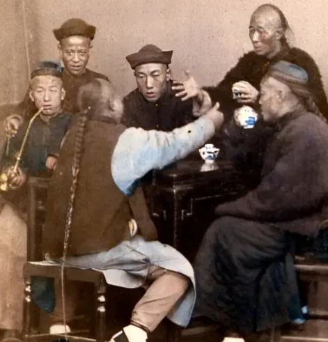 茶碗上边青花纹路,屁股下老藤椅,手里摁着的不单是一口茶,还有当年家长里短,桌对面那个抬手的动作,熟得像翻手拿铜板,谁常来茶铺里坐的,遇见就拱手招呼,来杯热茶,顺带往嘴里塞根旱烟,日子慢悠悠的,外头有风,屋里静得能听见说话声,电影里清朝总拍得死气沉沉,这画儿里谁脸上都看不出来那股阴郁劲。
