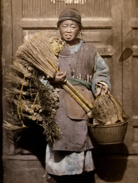 这个手里拎着一把扫帚的小孩,叫货郎娃,身上衣角破了口子,半新不旧的围裙一扎,腰上还系根破布绳,篮子里塞着苕帚土货,肩上褶皱都是真家伙。