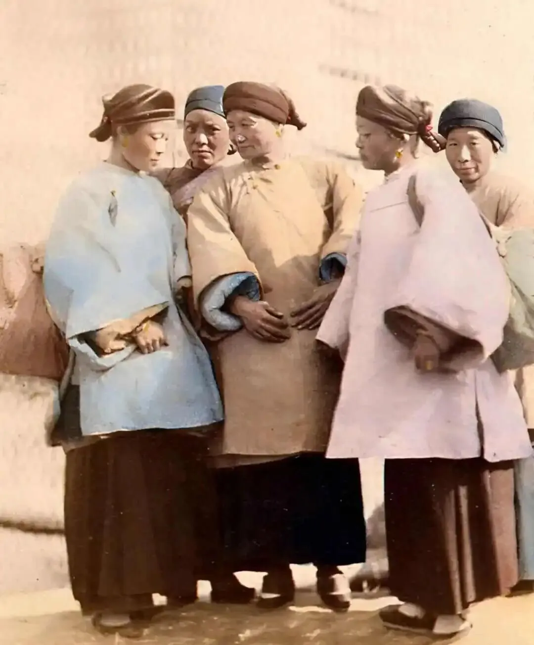 这五个人挤在画面里,图中妇人们的衣裳是偏宽松的,颜色浅的多,蓝、粉、灰各种都有,外边裹着旧式大袖,裤脚宽松,脚底踩的是布鞋,有几位还用手肘搭着衣襟聊地。