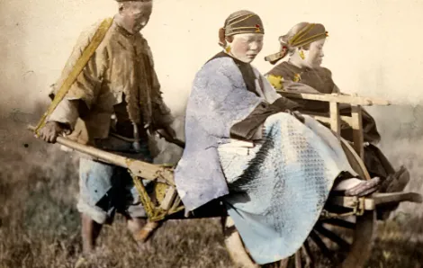 图上这个木制独轮车,那才真叫老交通,车把一捏就颤,车轮子够大,一男两女坐着,草垫裹着腿,一看就是路上赶集或者郊外走亲戚,推车的人裤脚卷起来,脸上全是汗。