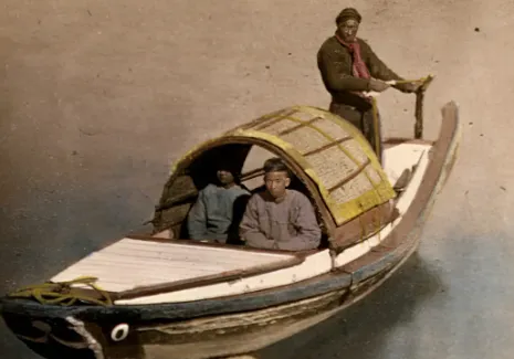这条木船叫摆渡小舫,条件一般人家可坐不起,两侧竹篷遮着太阳,船工手里握着篙,脚下有劲,河面上起早贪黑一桨接一桨,里头有一男一女眯着眼,估计走了好长一段水路。