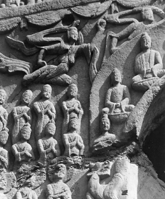 这个细节得慢慢看,一边是静坐的佛像,旁边却是飞天和舞者,雕得特别灵动,像风里能顺着跳下来,石头表面其实已经有点风化,小人们的衣摆、发梢都还能细细辨出来,小时候听二舅说,这墙上一半是信仰一半是人生活着要高兴,石里的舞乐就是日子里盼的吉祥劲头,谁家进庙想的是求平安求喜庆,和现在拜神灯许愿其实也差不了太多。