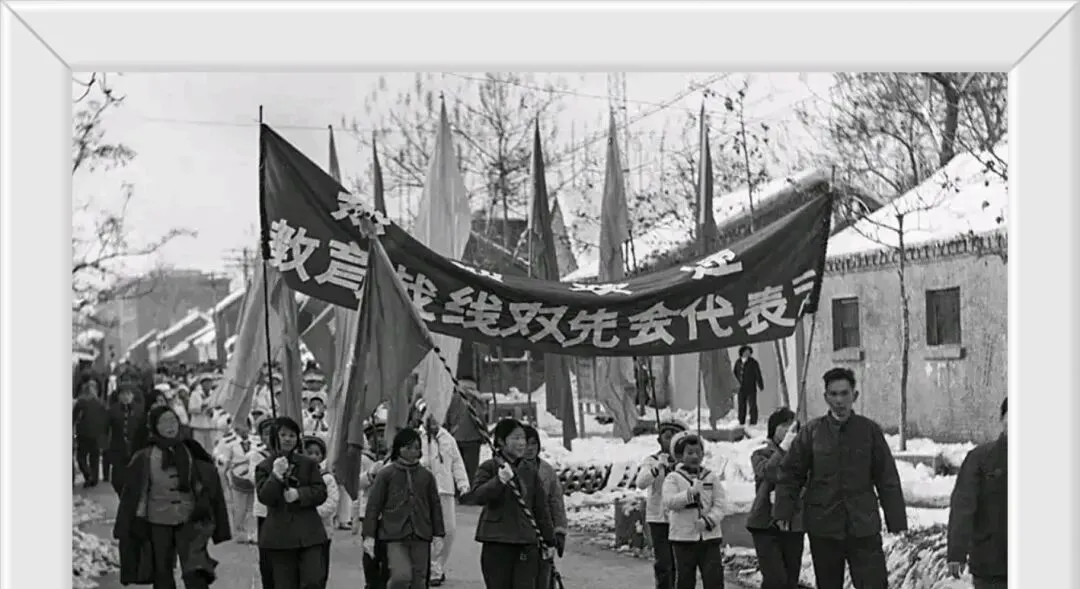 举着大旗的一队,是冬天表彰大会的游行,大人孩子一个劲地喊口号,雪地里留下的脚印排成行,老师被念到名字回头笑得实在,小孩拽着问奖状能不能借来看,老师按着袖子说“这可得收好了”,最高荣耀都在搪瓷缸里冒光。