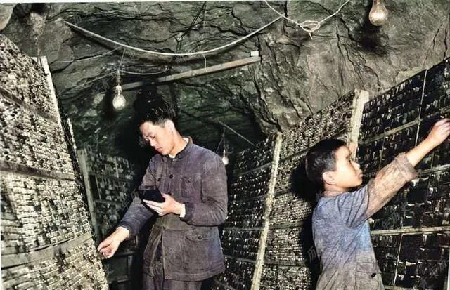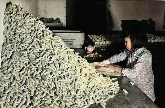 往后看,照片里的苦就更具体了。有人抱着自制土地雷,笑得很真;有人在洞里工作,头顶悬着灯泡,四周全是密密麻麻的零件;还有年纪不大的女孩,在桌边装填炸药,旁边堆成小山似的半成品。