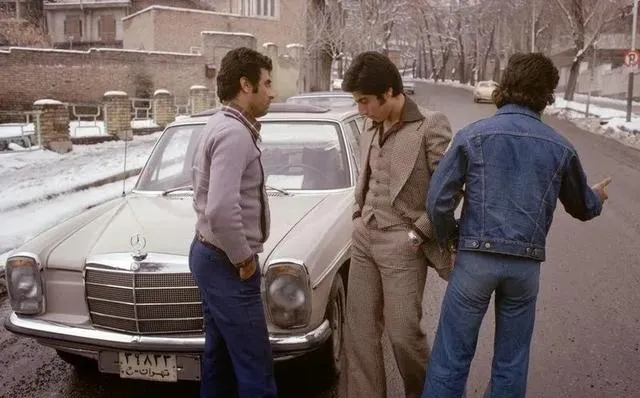这几位哥,车前站成一排,西裤喇叭口,呢绒大衣,牛仔夹克,手插兜咧着嘴说闲话,梅赛德斯车一停,路边落雪,气氛和七十年代上海青年差不多,这种装扮搁现在都不过时,谁说伊朗人死板,那会儿街头就是活生生的时装画报。