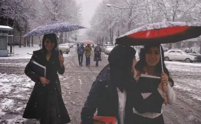 德黑兰一场大雪,姐妹们打着花边黑伞上课去,长风衣、靴子、亮面包裙,各种搭配,书抱在怀里,说说笑笑,谁会想到这地方后来会变得严严实实,妈妈还专门感慨一句,以前女生下雪天就是这么打扮的,不像现在,头发一个不小心露出来都要被管。