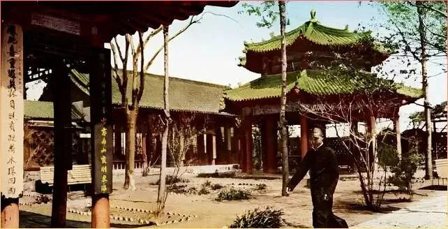 瞧这庙宇院落,布局工整.,古树参.天,还.有个穿长衫的老先生站在那儿。那个年代的建筑讲究风水格.局,一.砖一瓦.都透着讲究。院子里那几棵老树.,不知见证了多少.岁月变迁.。