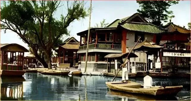 这两.张可是.大明湖的旧影.! 木船停靠岸边,传统民居临水而建.,湖面.波.光粼粼。当年的大明湖清净得很,哪像现在游人如织,那.时候的湖水更清,莲花更多.,划船的人也更悠.闲。