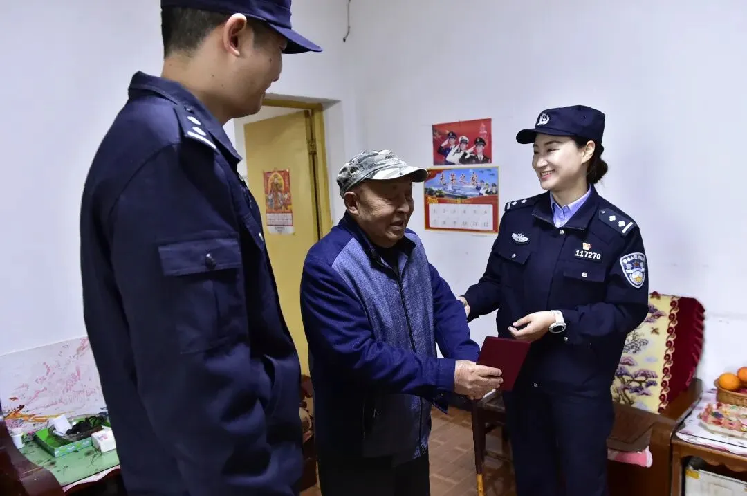 社区民警郝腾龙主动为90余岁行动不便的老人上门服务,将办好的户口迁移证件送到家中。