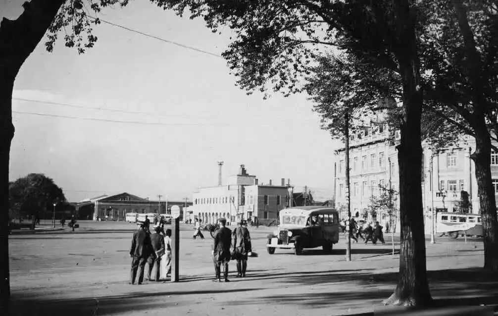 这火车站广场是进出城的第一步,站前空场子铺得老阔了,几棵树斜着影子,一辆辆有顶公交头尾都靠在这儿,车票不是随便能买,办事的、进货的、驻军的才敢天天踩这地面,有人背着包进城,也有人拎着布袋又出城,旧时的赶路人身影,现在已完全换了味道。