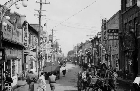 最后这一张是当年热闹得冒泡的商铺巷子,两边招牌密不透风,糖果店、布庄、药铺、洋行、全都挤在这点地方,过年过节,小孩跟着爹娘来逛,挤在人流里头,边上骡马粪味、豆腐摊子喊声和日文广播声混在一起,听着别扭又闹腾,现在再找这样混搭的烟火气,可真不容易。