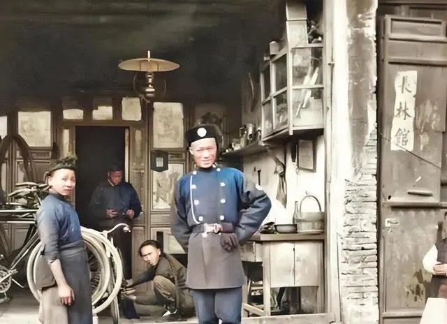 第一张最容易让人看走眼。门口站着的警察,已经不是很多人印象里那种长袍马褂的样子了,穿的是偏西式的制服,双排扣,腰间束带,帽子也挺讲究。可他身后的铺子、墙皮、木门、搁物架,又分明还是老北京街面的味道。新旧两种东西挤在一个画面里,这种感觉很有冲击力。