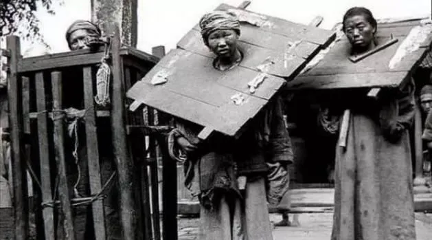 这张看得人有点沉。几个犯人脖子上套着沉重木枷,衣服又破又薄,人站在那里,连抬头都显得费劲。最扎眼的不是刑具本身,而是人被压出来的那种疲惫感。 木板很大,肩膀很窄,整个人像被拴在了命运里。