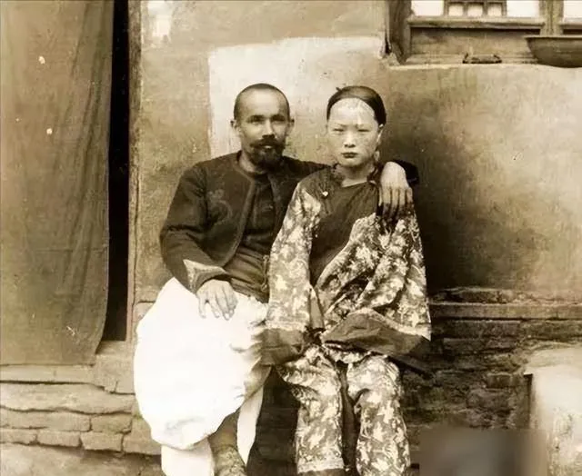 这组里最让人心里发堵的,还是洋人搂着中国女子合影那张。男人坐得很松,手臂搭在女子肩头,像是在摆一个很自然的姿势;可女子的脸是僵的,嘴角没有一点放松,整个人都缩着,眼神里有明显的不自在。说实话,这种情绪不用解释,一眼就能看出来。