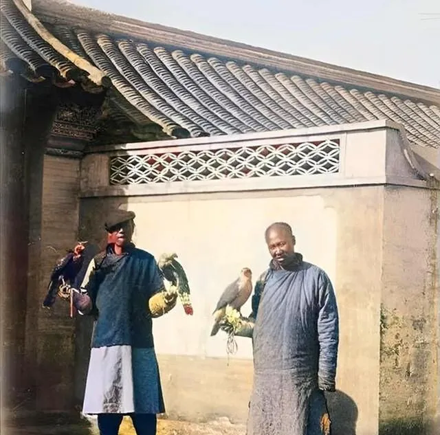 两个玩鹰的人,也很能说明问题。衣着不算寒酸,站姿有点散,手里架着鹰,像是在展示一种身份。以前总觉得晚清衰败是一句大话,可看到这种照片才明白,有些松垮,是能从人身上看出来的。旁边那张几个人歪靠在沙发边喝茶,更是把那股子游闲劲儿拍出来了。