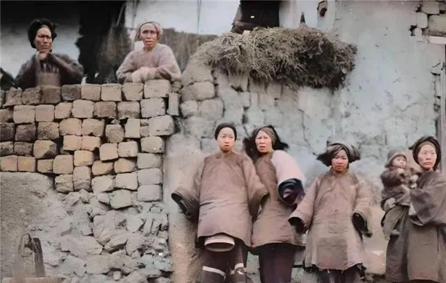 再往下看,反差就更明显了。普通妇女站在破旧土墙前,衣服宽大、颜色灰暗,头发梳得紧,脸上没什么表情,手里还抱着孩子。墙是土坯垒的,边角都掉了,屋檐下堆着草。这样的照片没什么“故事设计”,可生活的分量特别足。