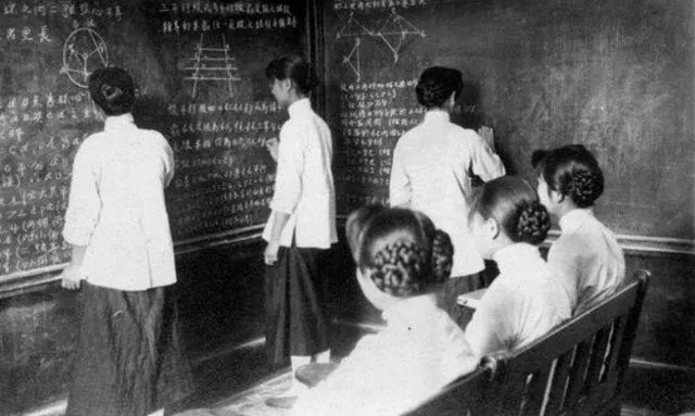 看到女校那几张,感觉突然亮了一下。教室里黑板写满了字和图形,女学生穿着浅色上衣,头发梳得整整齐齐,有人站着写,有人坐着听。她们不是看镜头,而是在上课,这种专注特别有力量。