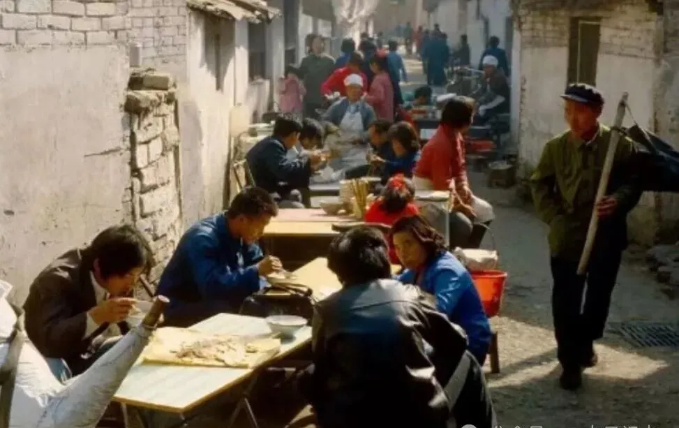 图里这一巷子就叫热闹,窄窄一条道,桌椅一溜排开,巷子尽头晃着阳光,空气里带着早点香味,桌子矮,碗筷花样杂,大家蹲着也能吃得香,左邻右舍都认得脸,小贩推着车来一句“油条新出锅”,人群就活泛起来了,以前没有外卖,早饭都是这么搓一碗,一边吃一边唠,最怕的不是天冷,是早点摊没开门。