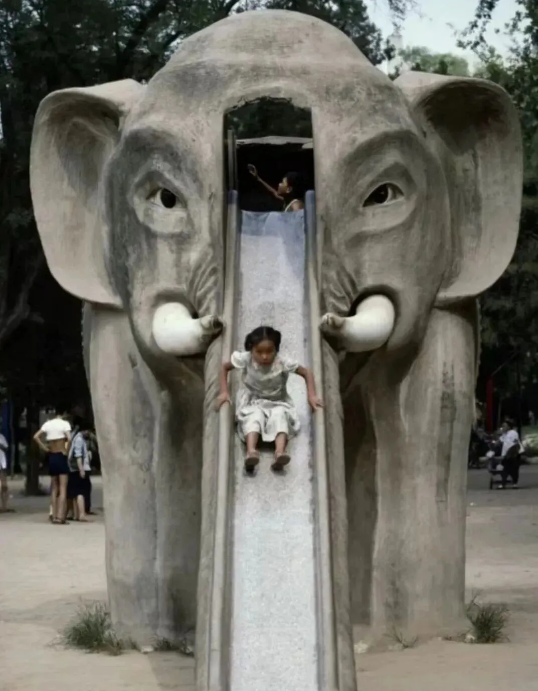 这座大家伙就叫大象滑梯,水泥做的,巨大的象耳象鼻子,滑道从象头上穿下来,小时候爬上去腿发抖还要装镇定,那阵子公园里没什么游乐设施,这种滑梯就是顶流,衣服磨破点无所谓,下来再爬上,玩上一下午也不腻,小孩们互相鼓劲,看谁敢第一个滑下去,有时候家长端着热茶站一旁,一边喊慢点,一边让你别带泥回家,现在的塑料滑梯安全不少,可那种期待和激动早没那么强烈。