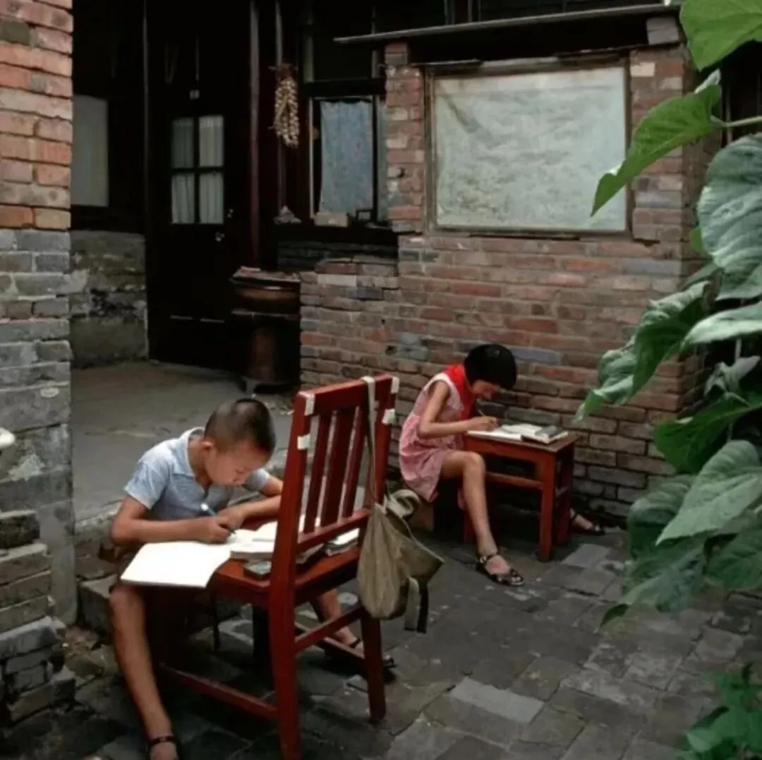 砖墙角落摆着的小桌子,小时候写作业用就它,一椅一桌,红木腿子磨得冒光,书包一扔下来就趴上去画格子抄生字,那会儿课业没现在重,写着写着还能听见院儿里有人招呼吃饭,作业纸皱皱巴巴,错了自己改,不及格最多妈妈喊两句,暑假的傍晚,一边学写字一边琢磨晚上有啥凉菜,谁家锅里冒烟就知道邻居做啥菜了。