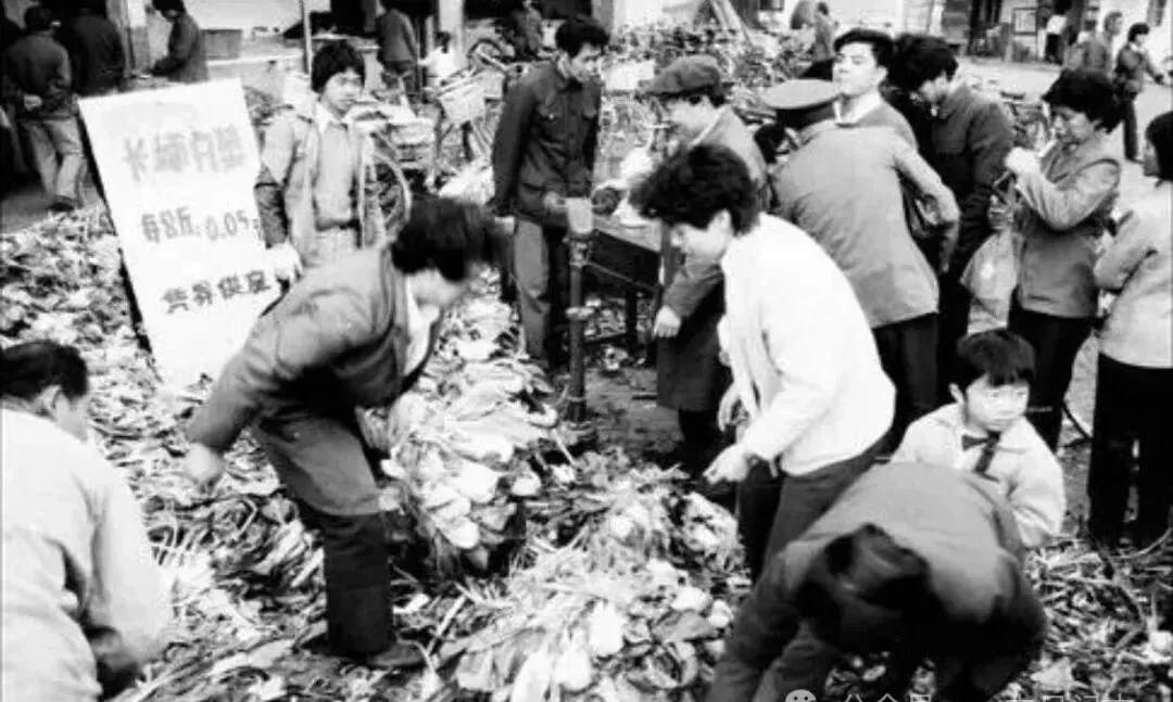图里的热闹摊位是龙翔桥的菜场,旁边那块白板扎在人堆里特别醒目,上面写的——“每公斤0.05元”,白菜堆得跟小山一样,摊前头弯腰扒拉的叔叔阿姨们全都动作麻利,看着不是在随便挑,是要把手摸到最结实的那一颗,家里老杭州嘴里常念叨“那会儿买菜还得拿票”,一到冬天腌白菜坛子排一圈,能吃大半个季节,现在的年轻人拿手机点菜,想象不到当年人挤人抢个青菜的样子。