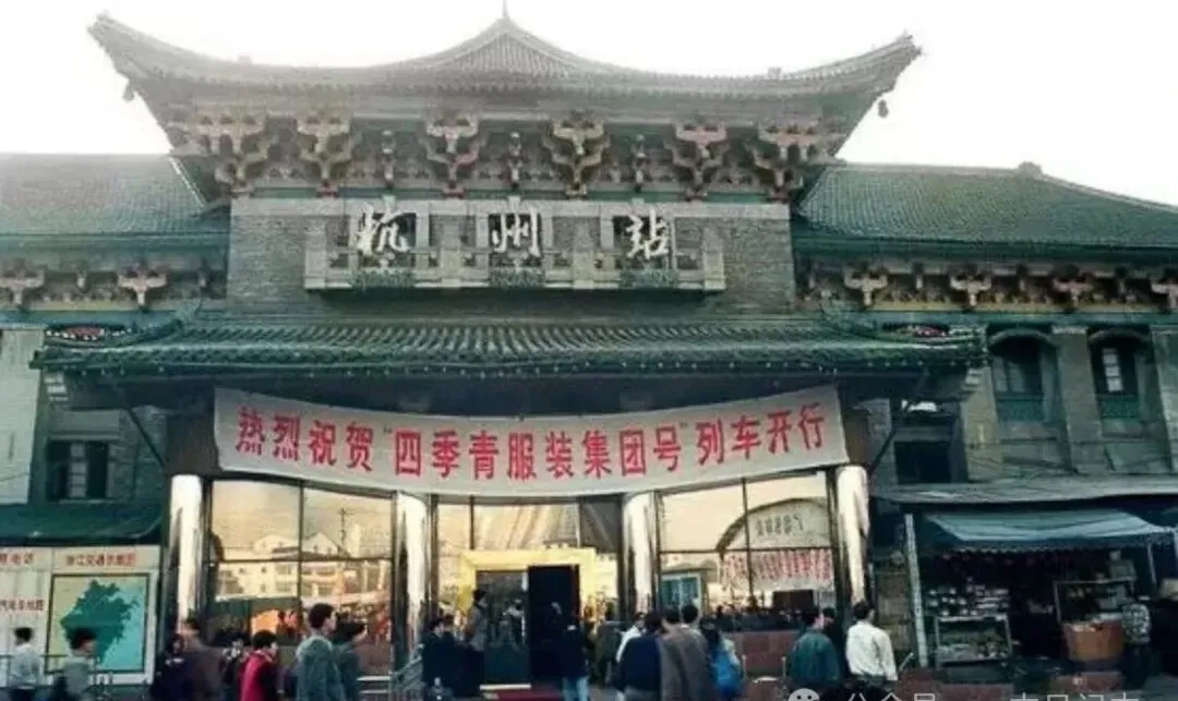 你瞅这扇门楼,就是原来的杭州站,那块牌匾字特别大,宽宽敞敞和现在地铁口一点不搭边,正门横幅挂着“热烈祝贺”,一股复古味,门前人流来来往往,一派忙碌劲,那时候去外地不是开车自驾,火车站是冒险故事的起点,行李堆在角落,旅客站人堆里等着检票,四季青的名声就是这样从老火车站里走出去的,如今改头换面,想找老站的这些影子,根本没地找。
