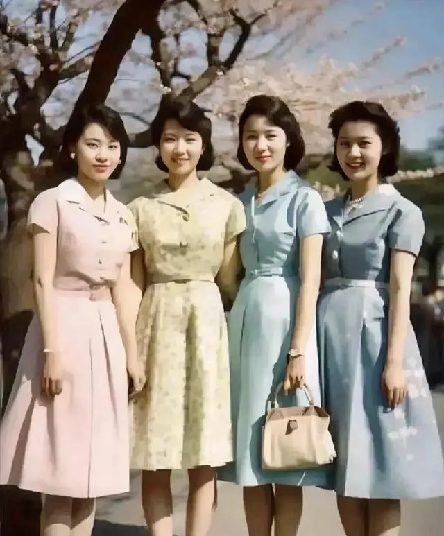 四位姑娘开春时候照的,衣服都是淡色的花布裙,脖子上栓根链子,大家伙多少都梳着羊角卷,站在盛开的花树前头,和现在整整齐齐的大波浪是不一样的,那个时候的美,带点拘谨,又藏着一股自信。