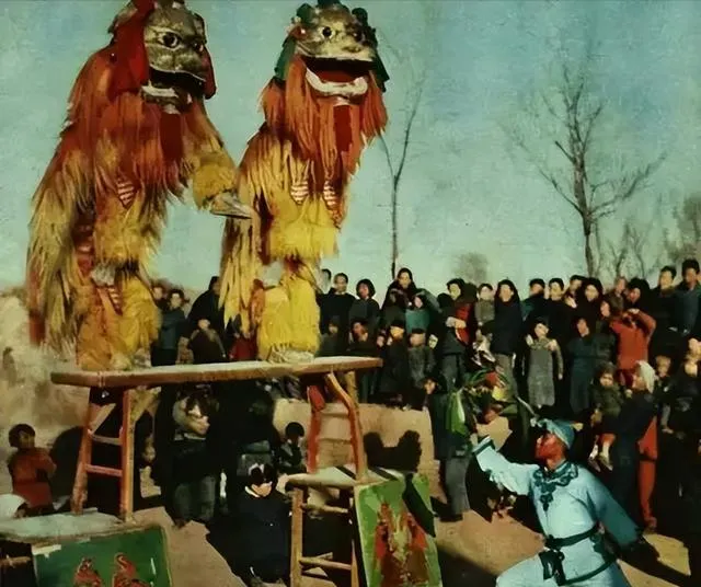 舞狮子表演,毛茸茸的大狮头,一上桌子就人山人海,那阵子每逢过年年节,村口都要舞一场,孩子们围着蹦跶,大人们吹着口哨叫好,舞狮小伙喊声嘴皮子利,累了赶紧下来喝口水,又得准备下一场。