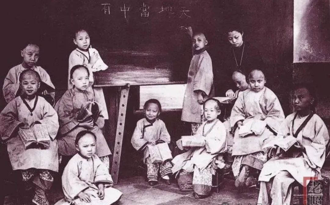 图中一群小女娃全围着黑板坐着,衣服宽松,麻布料子随身,手里捧的启蒙课本已经卷了角,黑板上四个字“天地当中”,脑子里都回荡着那句儿,“有个我”,她们跟着老师暗暗念,眼神认真极了,屋里光线不很足,地上铺着土,瞧着格外安静,咋往后一对比,现在的教室可暖和多了,大孩子小孩子都有板有眼地坐着,桌椅新了,书香也浓。